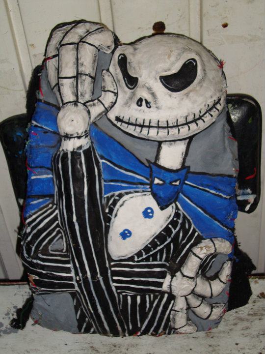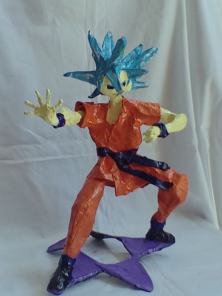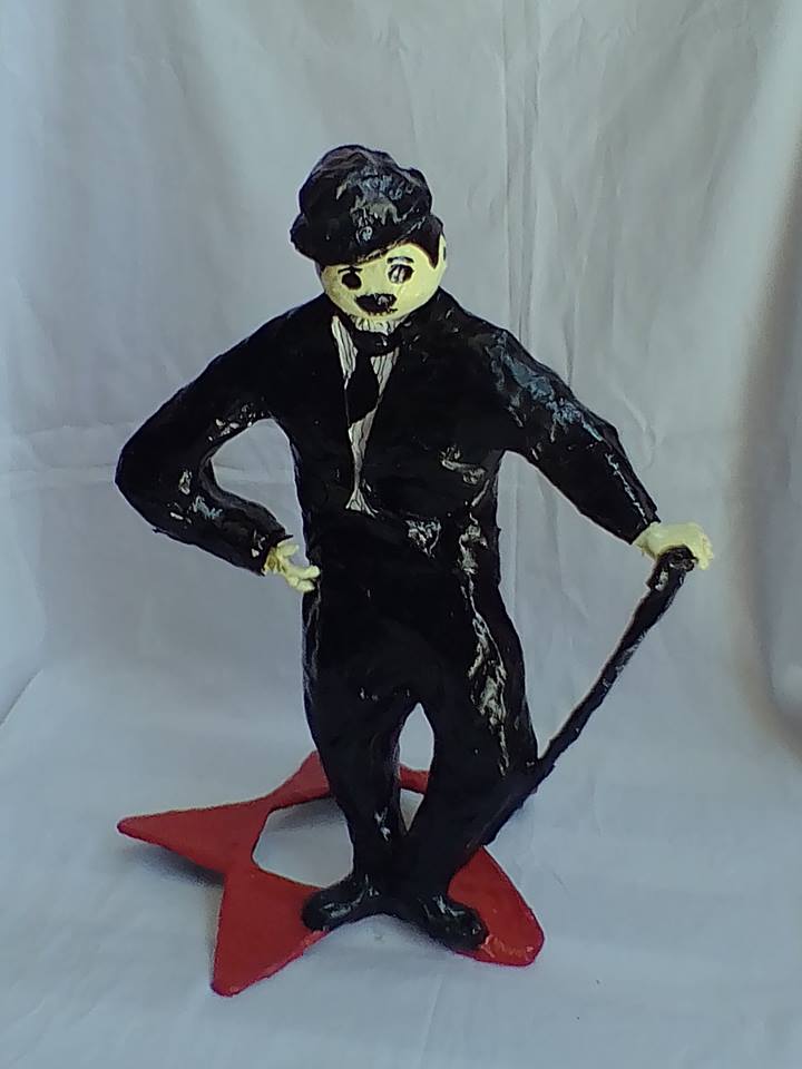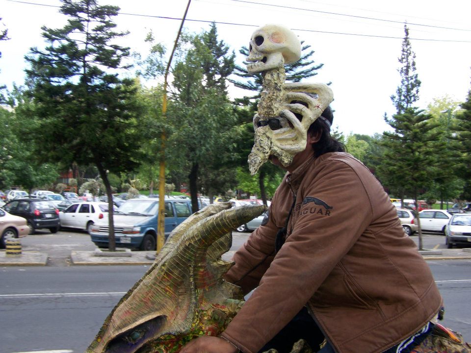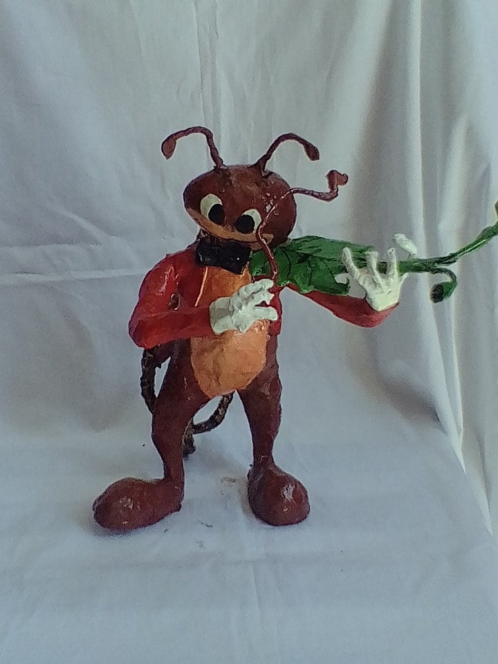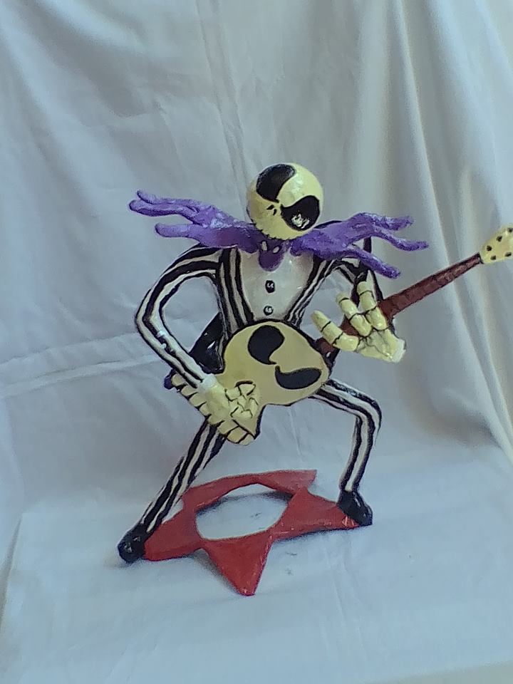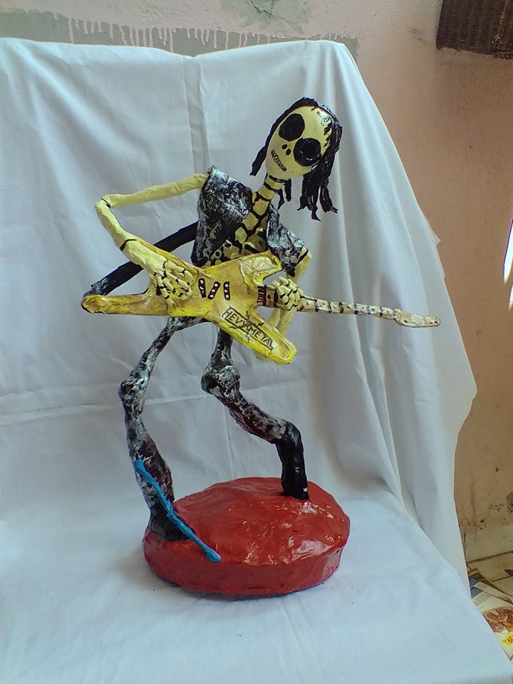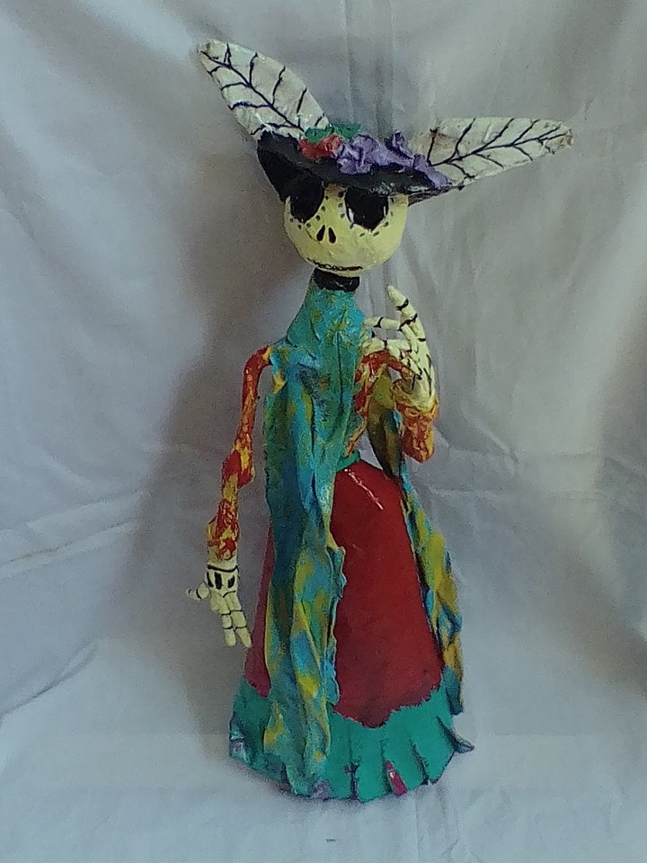 Catrina y diablos: dos figuras emblemáticas en su haber. Las catrinas: grandes y chicas. Lo que le gusta de ellas es hacer su vestimenta también toda de cartón, pues algunos prefieren usar tela; él no: él ama el material que usa y modela con sus manos sabias. También están las Santas Muertes que a muchos causan miedo, con sus patas de pollo peladas en vez de manos y pies; y su huacal y pescuezo de pollo también, para hacerlas particulares y más naturales.