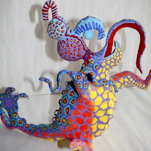 En cuanto a los alebrijes ha buscado siempre una originalidad propia, desarrollando formas no tradicionales y dándoles un colorido lleno de detalles y único. Sus piezas varían en tamaños, desde los quince centímetros hasta las obras monumentales para concursos. Ocasionalmente ha hecho miniaturas de 8 cm. El más grande que ha realizado midió 4.30 m. de lago y 3.50 m. de alto. También ha concursado en el Museo de Arte Popular de su localidad con piñatas, que siempre hace de manera especial, ¡tanto que a veces los clientes deciden no romperlas! Algunas de las piñatas más raras que ha hecho son una con forma de botella de brandy Presidente, de la que cuidó muy bien los detalles cotejándola con una original y una motocicleta Harley Davidson. Cualquier tipo de personaje de dibujos animados o serie de súper héroes que le soliciten es capaz de realizarla sin dificultad. Y aunque aprecia el arte cartonero en libros, de momento no se dedica a él por otros compromisos, pero considera que el arte que se puede desarrollar en las portadas de tales libros es una gran oportunidad de expresión en pintura.