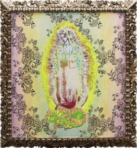Uno de los protagonistas de las obras que conforman “El jardín de los sueños” es la Virgen de Guadalupe quien es una figura importante para Kylla ya que no sólo es parte de su obra, también es parte de su vida y quiso plasmarla en su expo, pero con una reinterpretación de los elementos de la imagen original para meterla a un espacio diferente que genere nuevas lecturas.